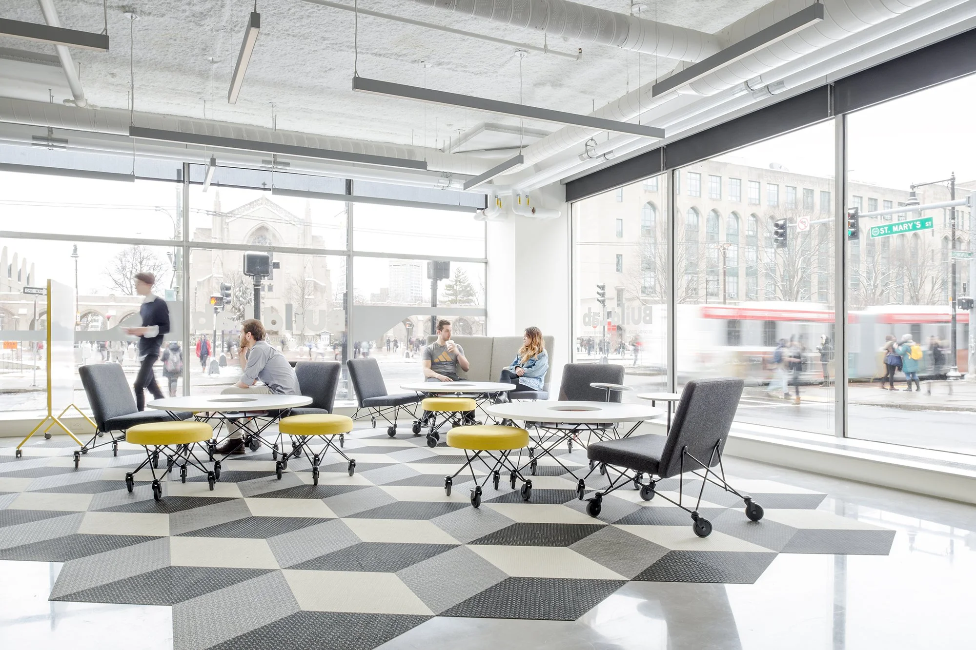 The BUild Lab at Boston University was one component of a larger set of space moves that the design team worked on with the University. BU identified this highly visible storefront, which was previously leased to Radioshack, as a perfect site for one node within their multidisciplinary network of maker and innovation spaces throughout campus. Named the BUild Lab, this space incorporates staff offices, small and large conference spaces for student teams, open workspace, and informal collaboration areas that double as presentation areas for larger events. The team used mobile furniture and partition solutions where possible to allow programming to flex over time.